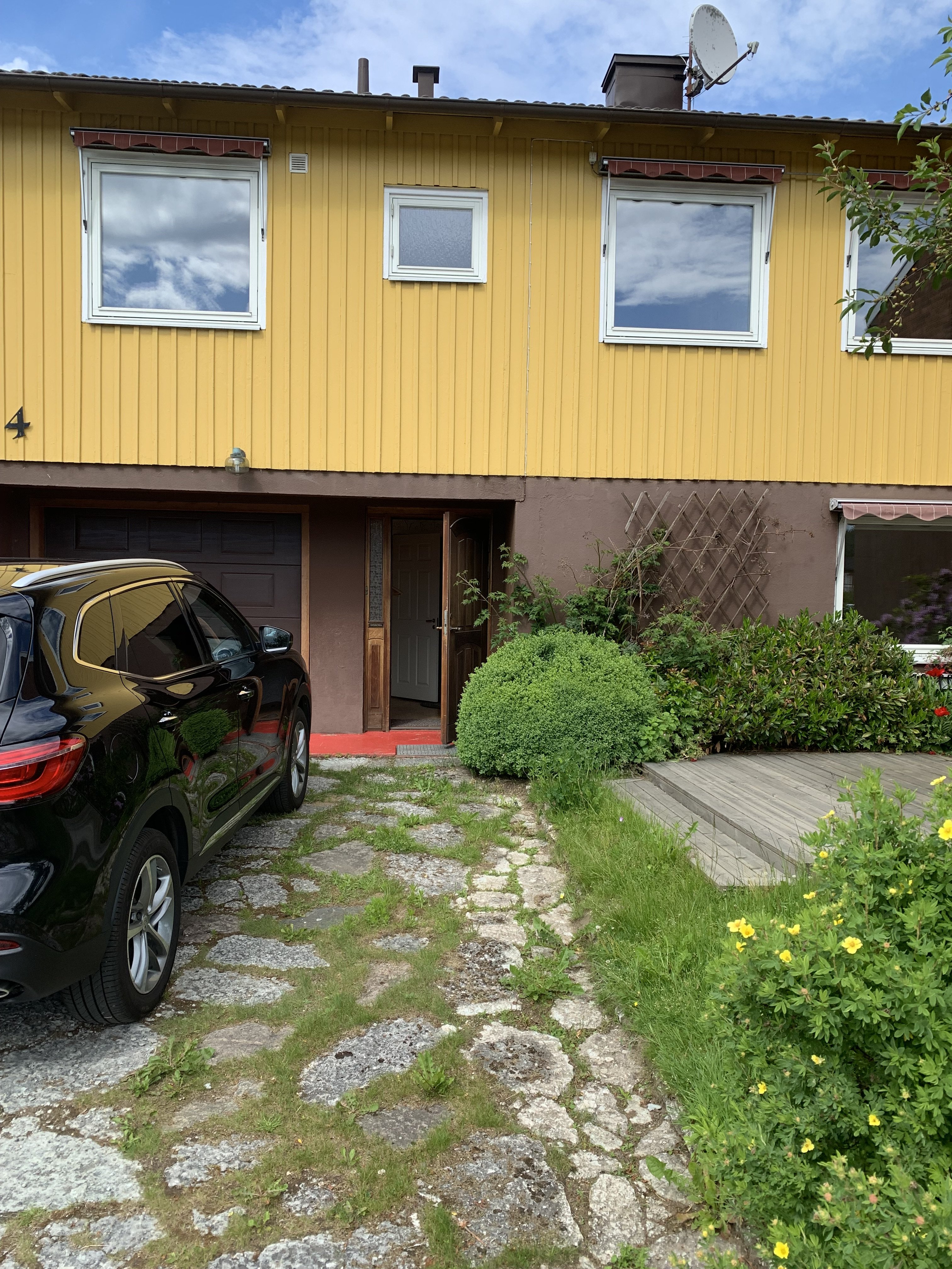 Entre med 2 sovrum, wc och tvättstuga. Våningen upp 2 sovrum, vardagsrum, kök, badrum och inglasade altan. Trädgård parkering fram och back av huset. Busshållplats 300m till huset Köpcentrum 900m till huset